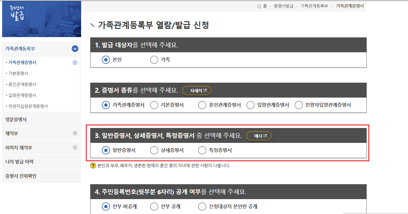 - 일반증명서: 본인과 부모, 배우자, 생존한 현재의 혼인 중인 자녀에 관한 사항