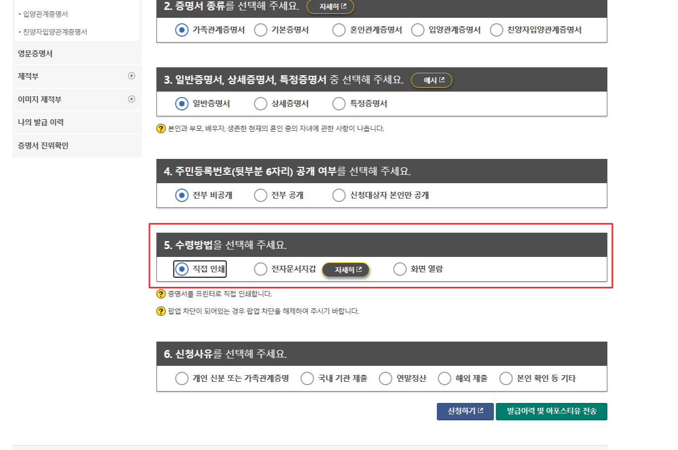 - 발급 대상자 및 증명서 종류를 선택하고, 주민등록번호 뒷자리 공개 여부와 수령 방법을 설정합니다.